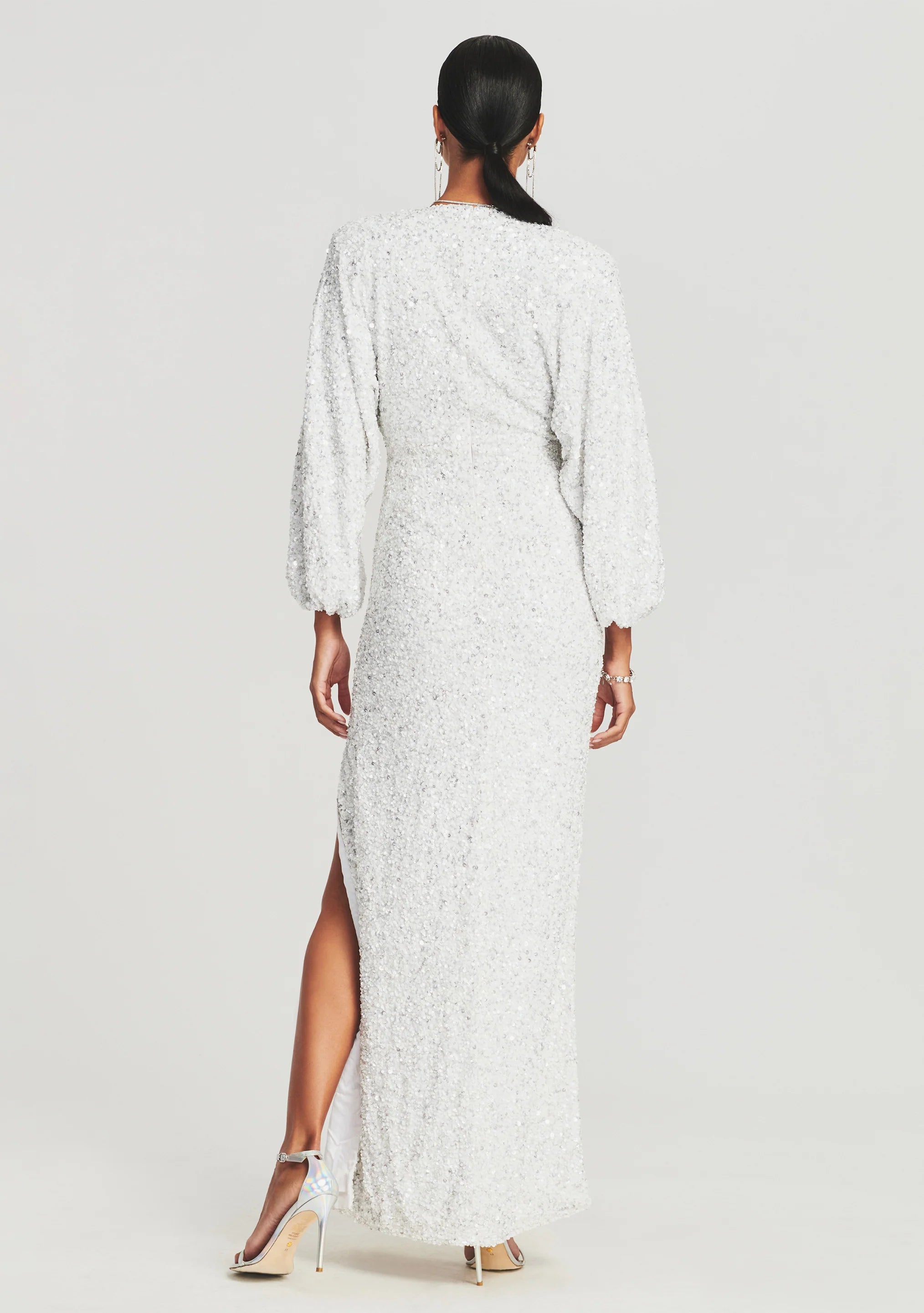 Our Camille Dress captures the glamour of decades past through its meticulously embellished, maxi-length design. Cut in a body-skimming silhouette, the glittering sequin design features a plunging neckline, draped balloon sleeves and a seductive leg-baring slit. The dress features an invisible back zip closure. Shown here in White.