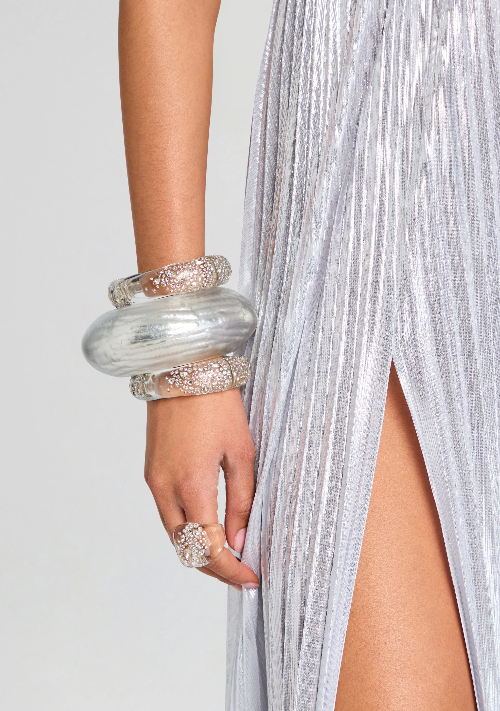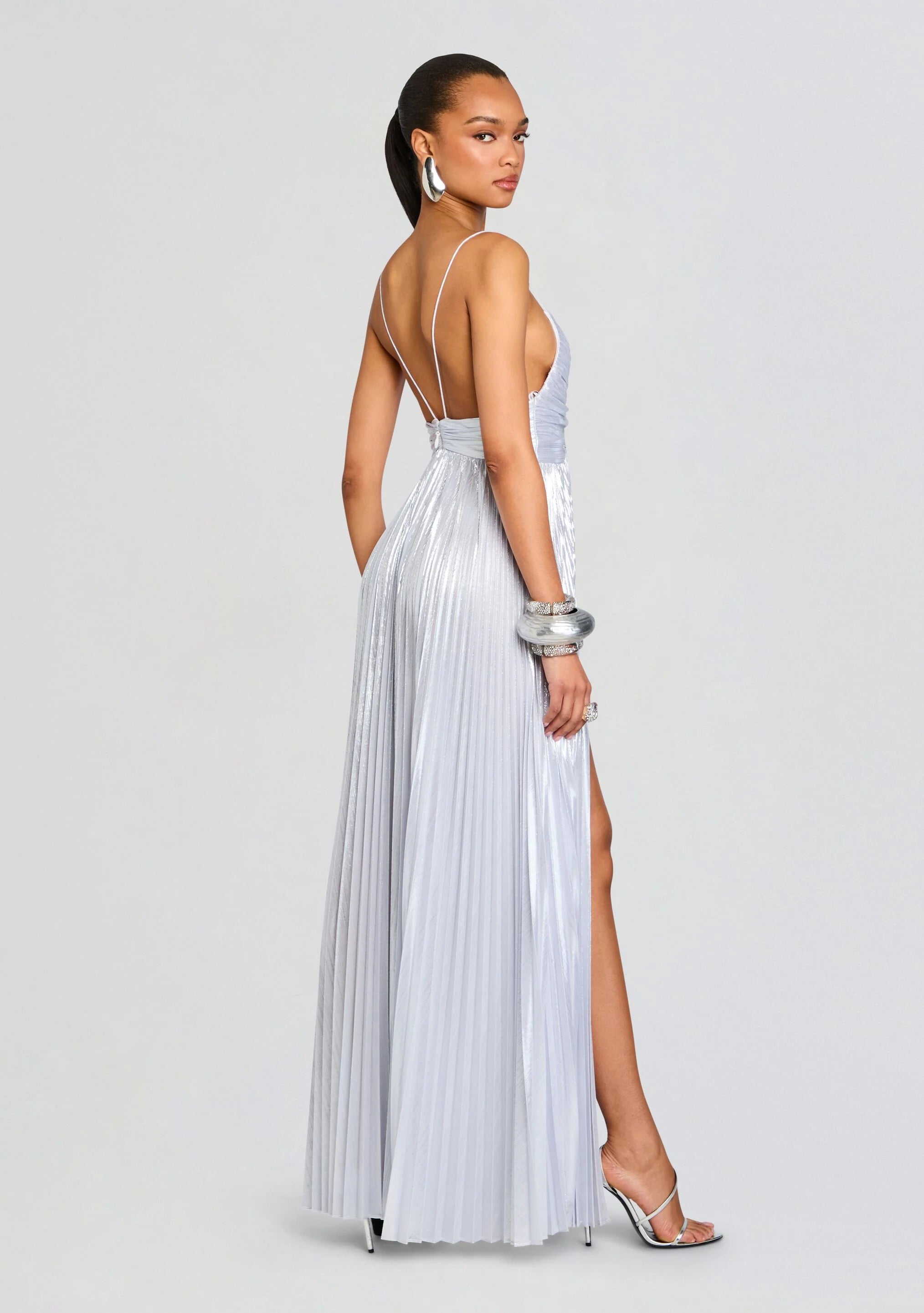 Elevate your elegance with the Carolina Dress. Dazzle in the luxurious lame gown, perfect for special occasions. The high slit adds a fun touch, allowing you to glide through the night with poise and grace. Make a statement in this exclusive piece.
