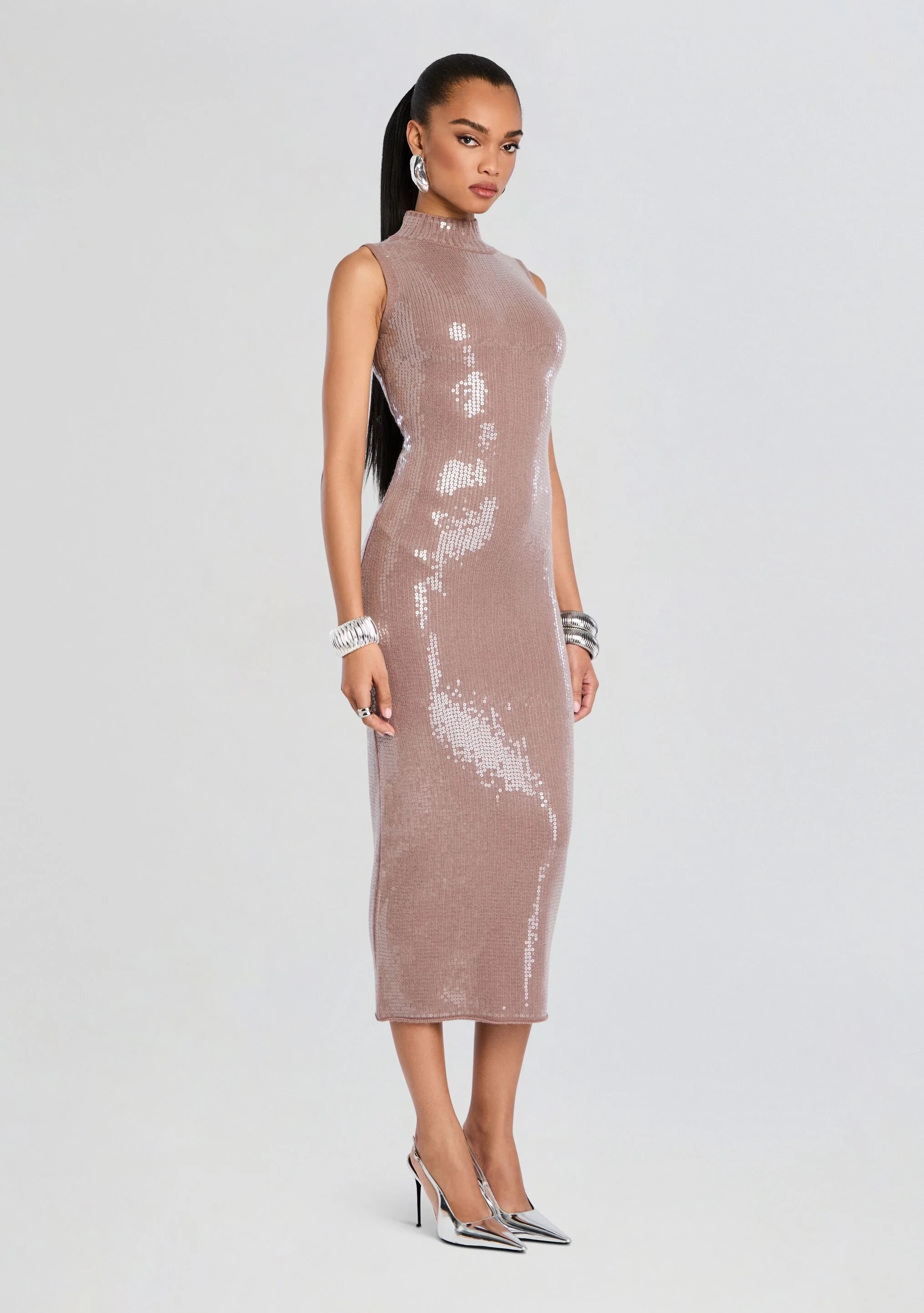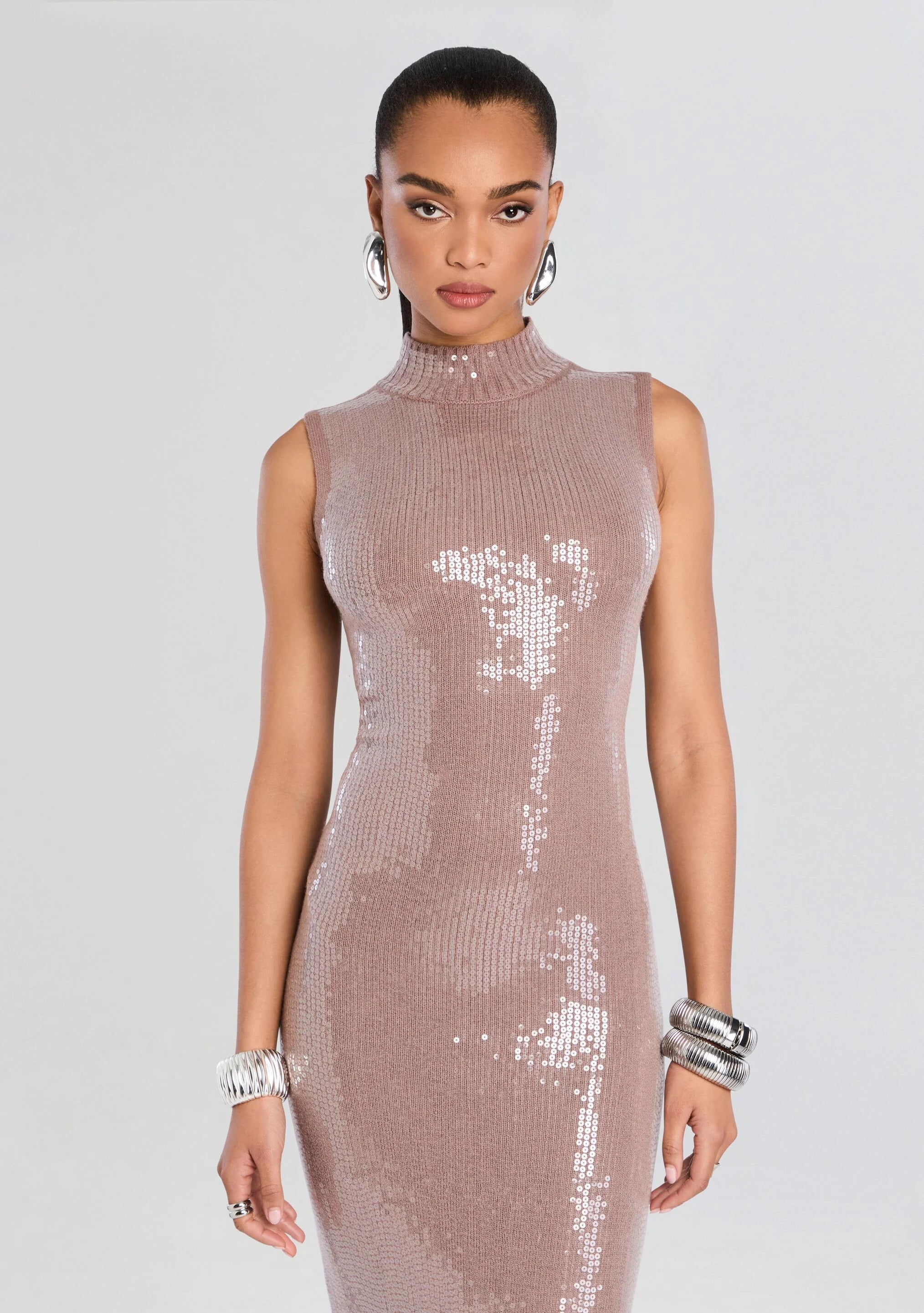 Indulge in luxury with our Dove Sequin Knit Dress. Featuring a high neck design and all over sequins, this dress is perfect for any occasion. Stand out in style and elevate your wardrobe with this elegant and tasteful statement piece.