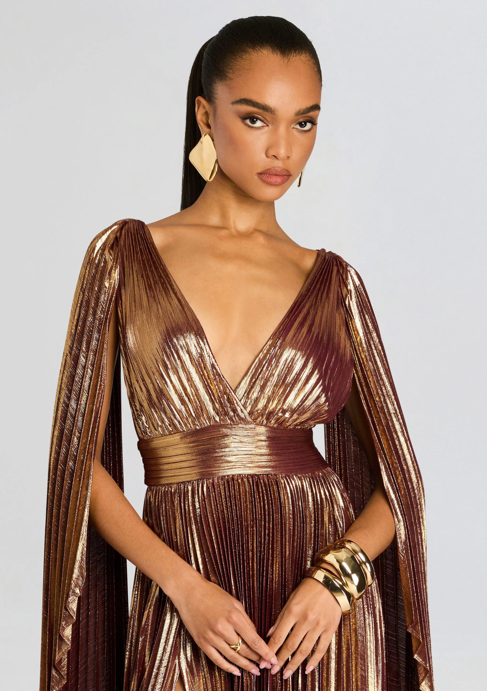 Effortless elegance meets sultry sophistication with our Eleri Dress. Crafted from luxurious lamé fabric, this gown boasts a plunging neckline and high slit, creating a stunning silhouette. The flowing back straps add a touch of whimsy to this exclusive piece, perfect for any formal occasion.