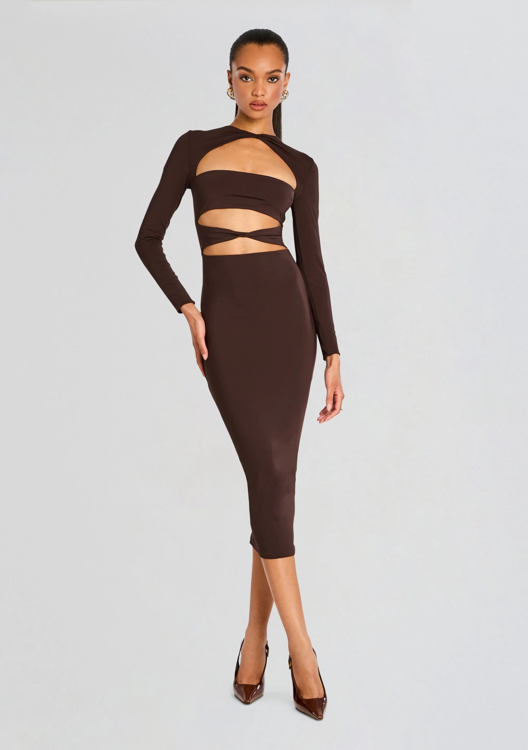 The Karma Dress by SEROYA is a sultry take on the staple bodycon dress. This long-sleeve jersey dress with a bateau neckline features multiple cutouts and flattering twist details at center front. Shown here in Ash Brown.
