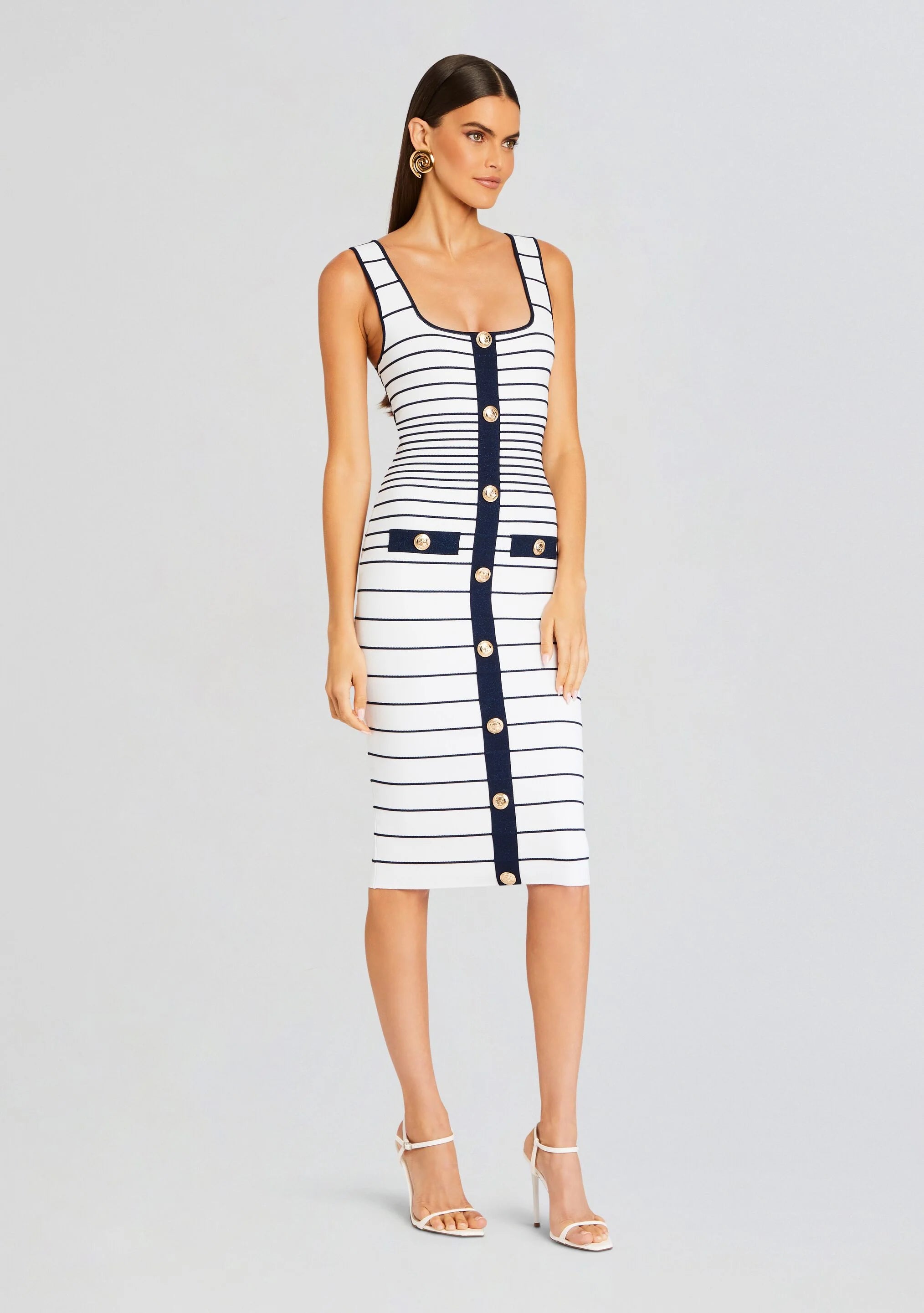 Effortlessly chic and comfortable, our Lyle Dress is a versatile wardrobe essential. The soft knit fabric and classic button-down style make it perfect for both casual outings and dressier occasions. Shown here in White/Metallic Navy.