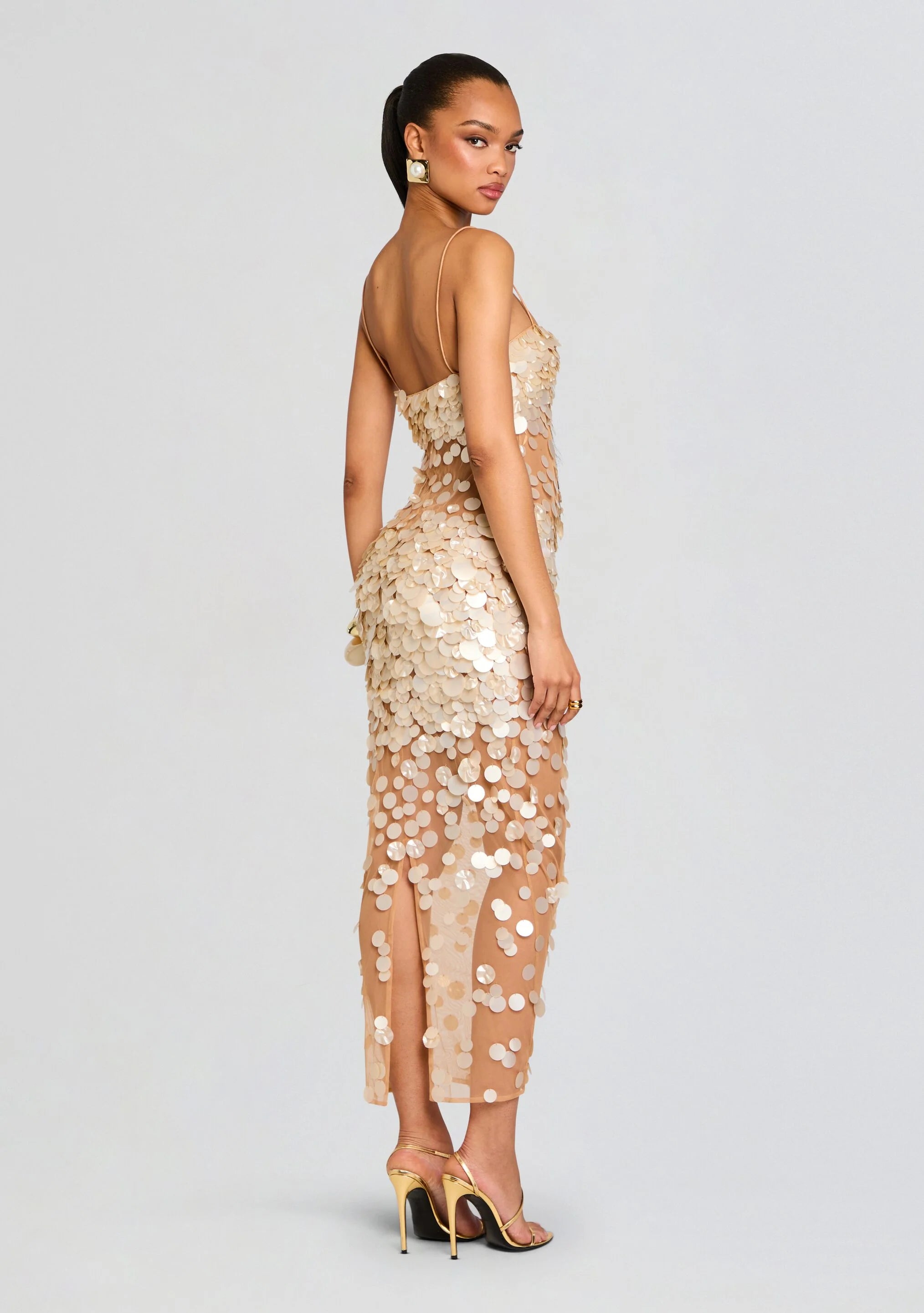 Shimmer and shine in the Mischa Dress. This dazzling creation is adorned with iridescent sequins that catch the light with every move. Its sleek silhouette and sheer detailing exude modern glamour, making it an unforgettable choice for your next special occasion. Shown here in Nude/Champagne.