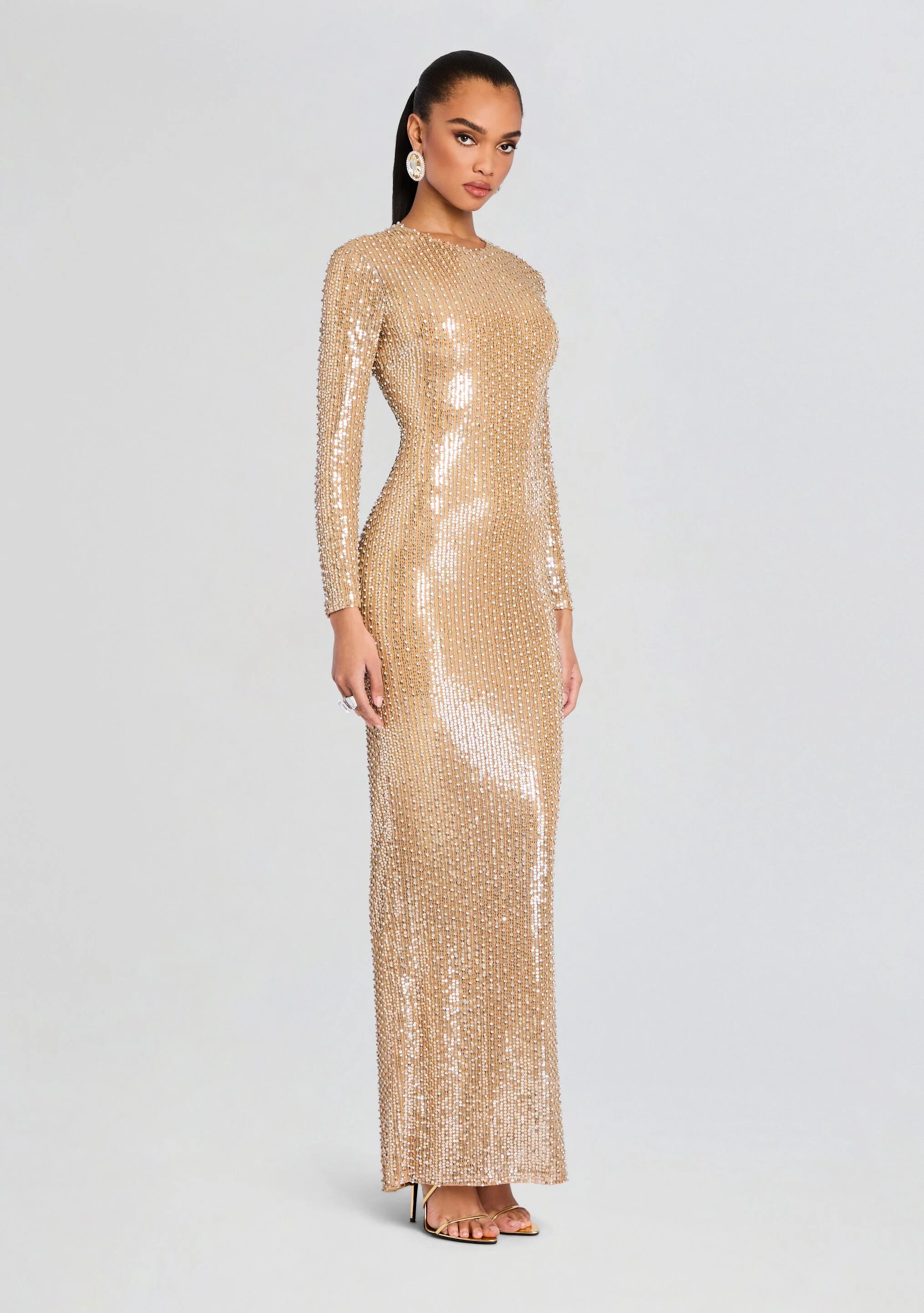 The Monette Sequin Dress is a dazzling gown designed for special occasions. Featuring long sleeves and an all-over sequin finish, it offers a classic silhouette that catches the light with every movement. Perfect for making a memorable impression, this dress blends elegance and sparkle effortlessly. Shown here in Nude/Gold/Silver.