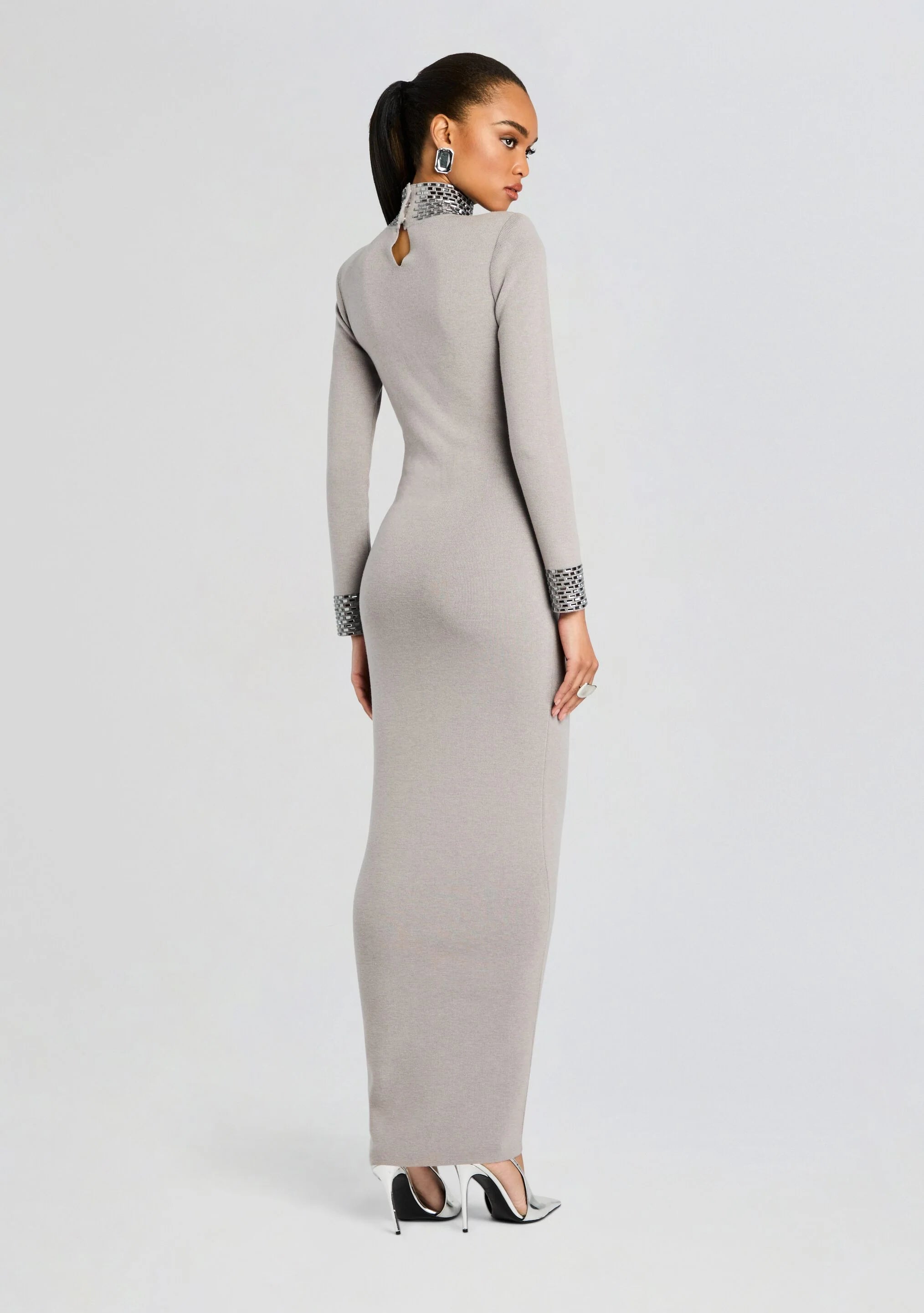 Step into sophistication with our Monroe Dress, boasting a long sleeve design, embellished high neck, and sequin cuffs. This knit, sweater-like gown exudes grace, class, and comfort, making it the perfect choice for gala nights and upscale events. The delicate embellishments on the turtle neck and cuffs add a hint of luxury, elevating your style effortlessly. Shown here in Cloud.