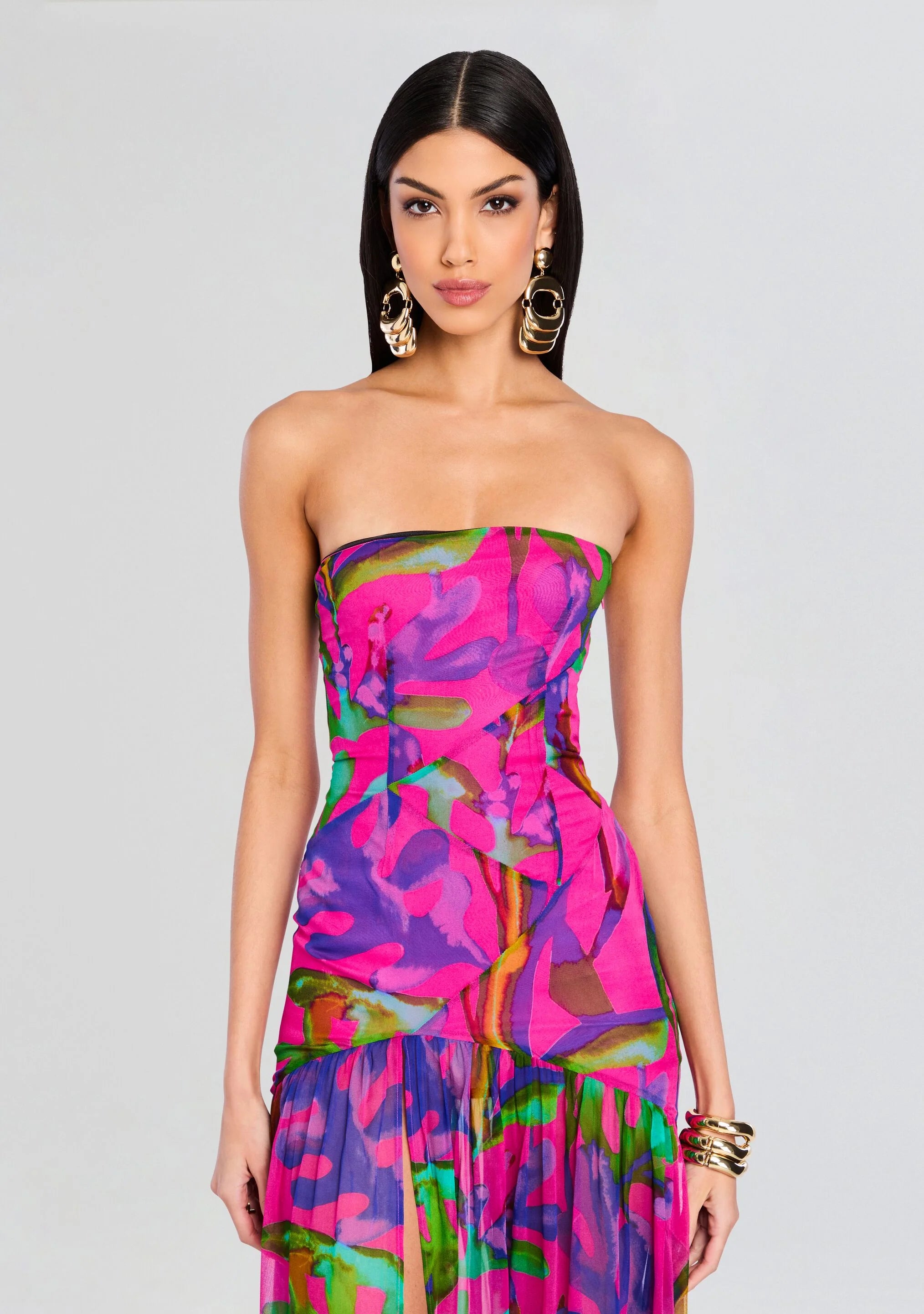 This strapless maxi dress features a tropical leaf print with bias-cut, frayed panels throughout the bodice, and a romantic, sheer skirt. A zipper located on the side completes the look. Shown here in Tropical Leaf.