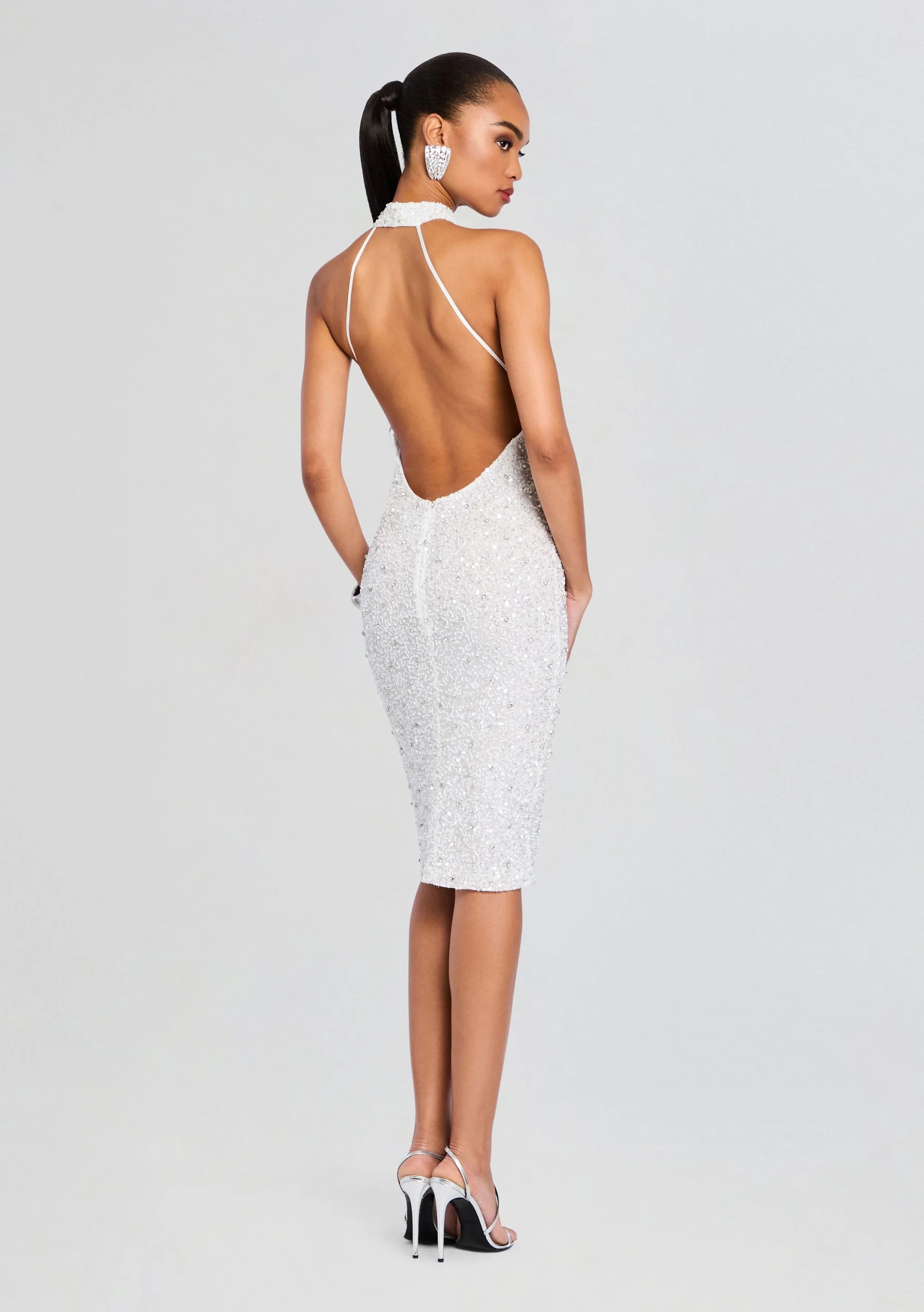 Turn heads in the Olivia Midi Dress. The form fitting midi is sure to command any room. With its halter design, featuring a slinky open back, the seductive silhouette is finished with a button closure at the neck and an invisible zipper closure down the body. Shown here in White.