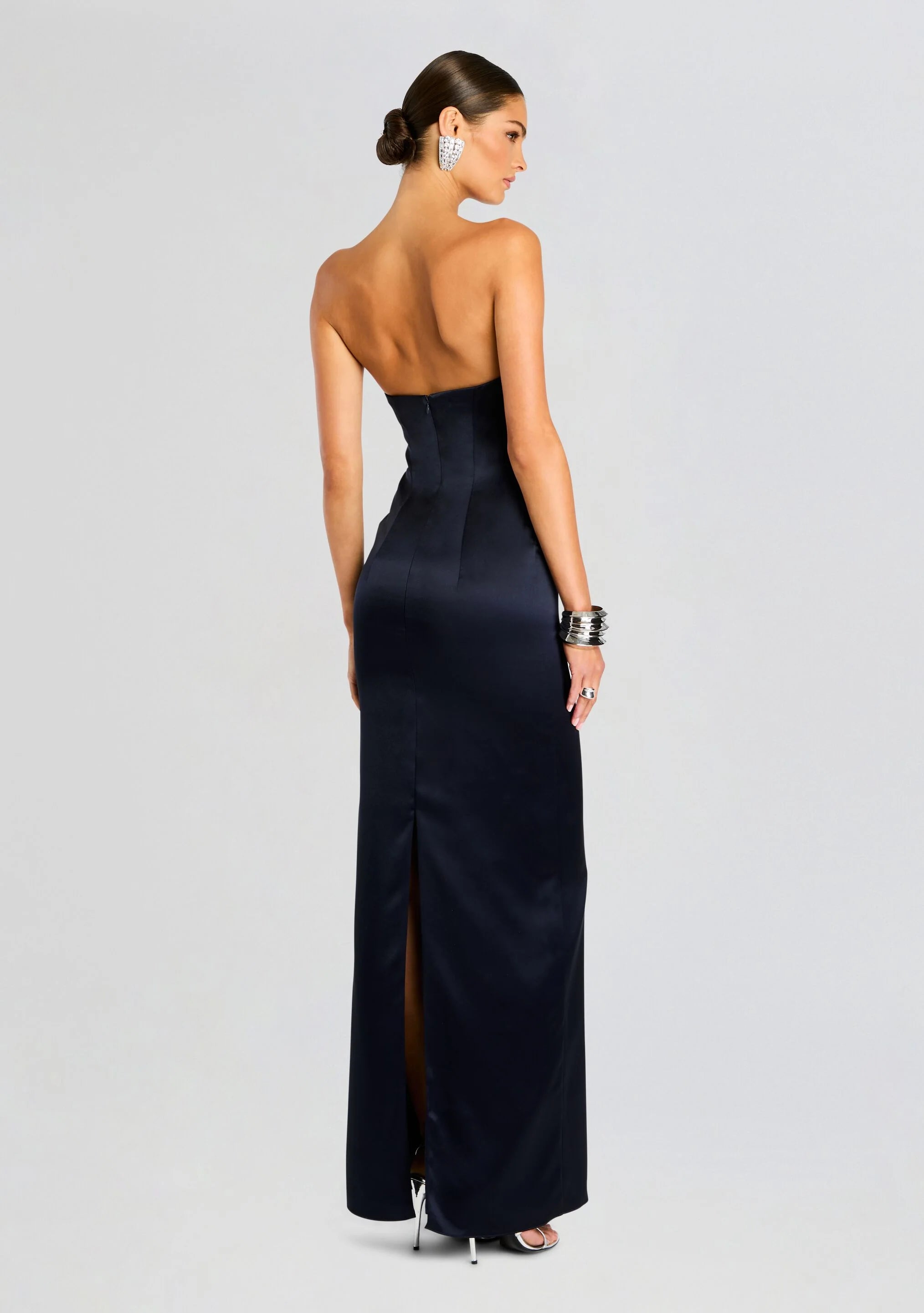 The Olivine Dress is perfect for a fall black tie event. Made from a silky fabric, this dress is form-fitting yet flattering with a modern knotted detail at the bust. Shown here in Navy.