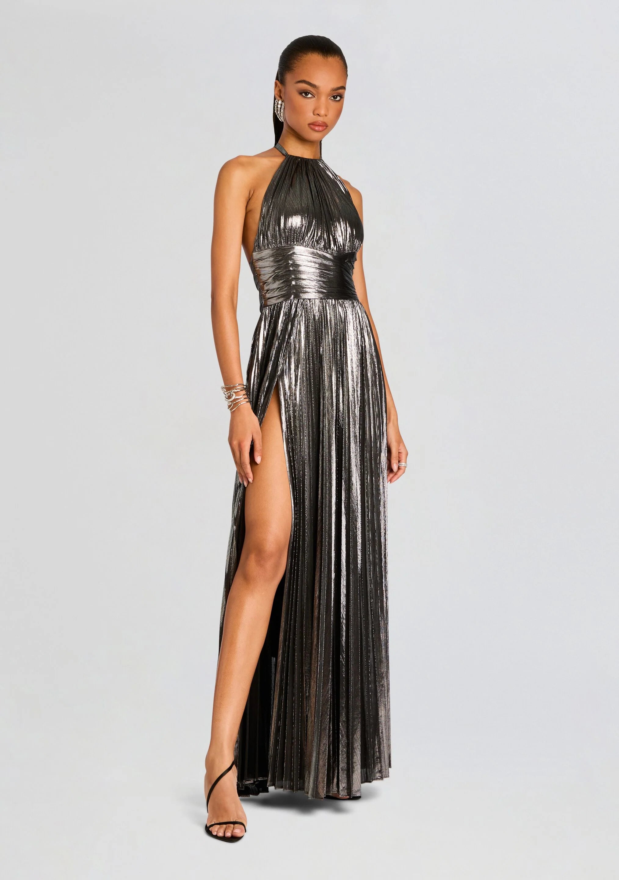 Embrace elegance and sophistication with our Reiss Dress. This exquisite lamé dress boasts a high neck and open back, exuding a sense of exclusivity and allure. A sexy leg slit adds a touch of seduction to this occasion dress, making it a must-have for any fashion-forward wardrobe.