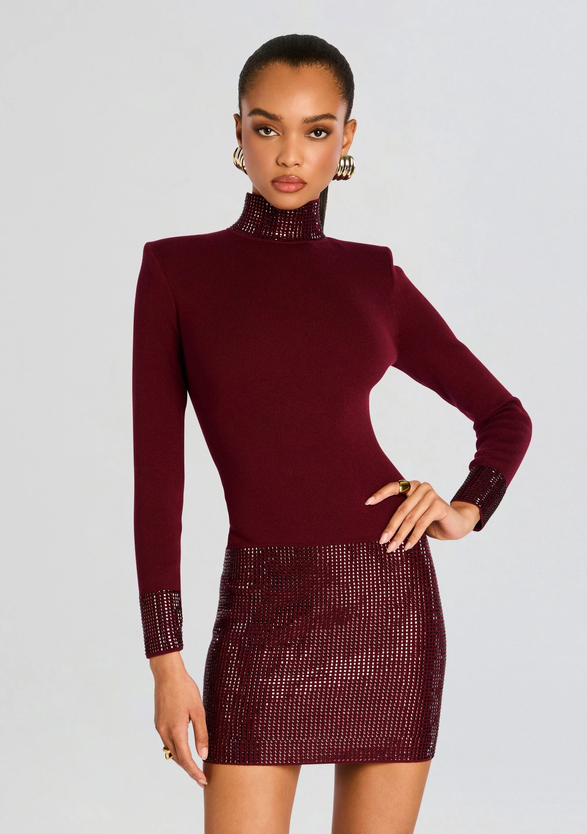 Embrace glamour with our Rue Dress, featuring lavish embellishments on the sleeve cuffs, high neck, and bottom. The material is a masterpiece of comfort and design, perfect for those seeking a comfortable yet elegant look, with a comfy knit material that envelops you in softness. The embellishments catch the light, creating a dazzling effect that will turn heads at any event, making it a must-have in your wardrobe. Shown here in Port.