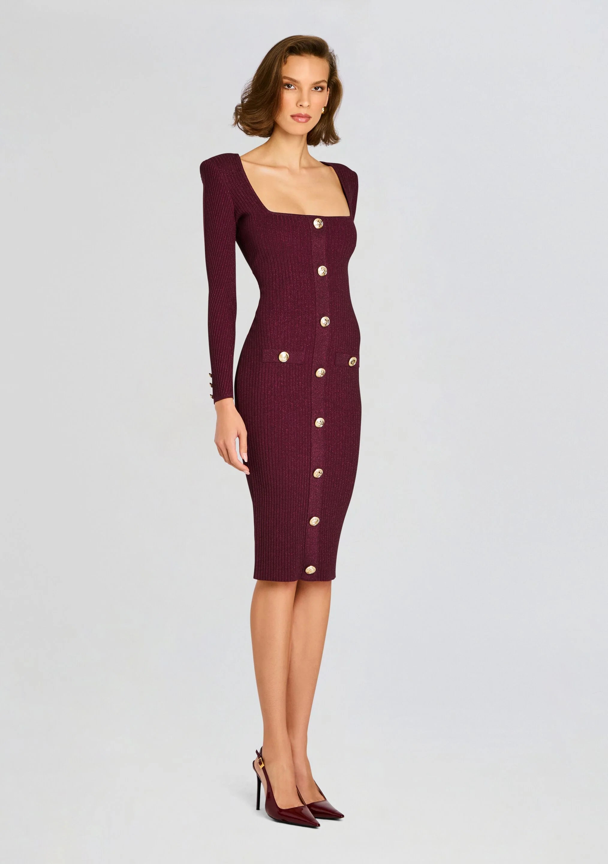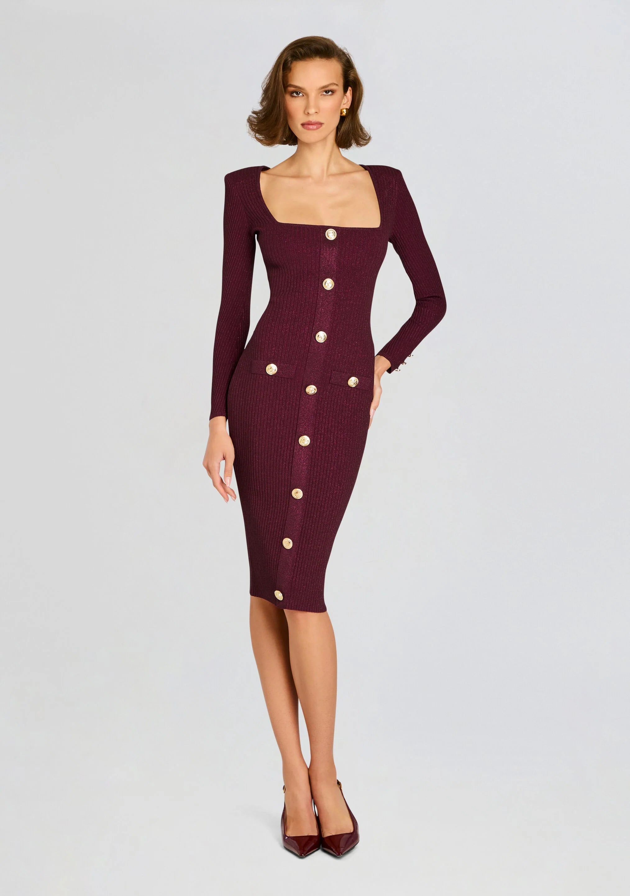 Indulge in elegance with the Sadelle Knit Dress. Crafted with a comfortable knit fabric, this midi dress features delicate button details and a sophisticated square neck. Perfect for a dinner date or cocktail party, this dress will elevate your wardrobe and make you stand out in any crowd.