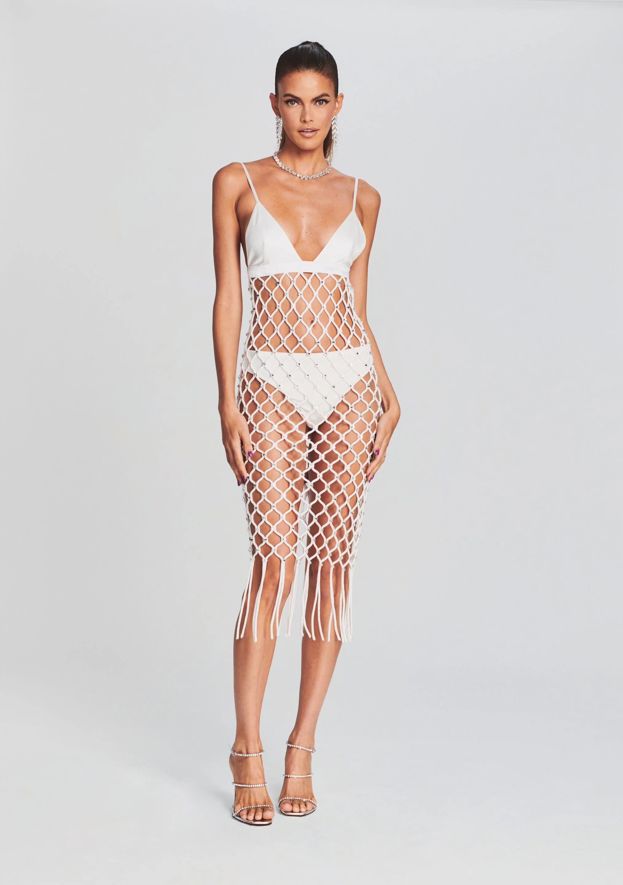 Get ready to make a bold and breathtaking statement with our Sandra Dress. This stunning stretchy style takes cutout dressing to another level with its daring, embellished apertures layered over a matching white undergarment that will have all eyes on you. Shown here in White.