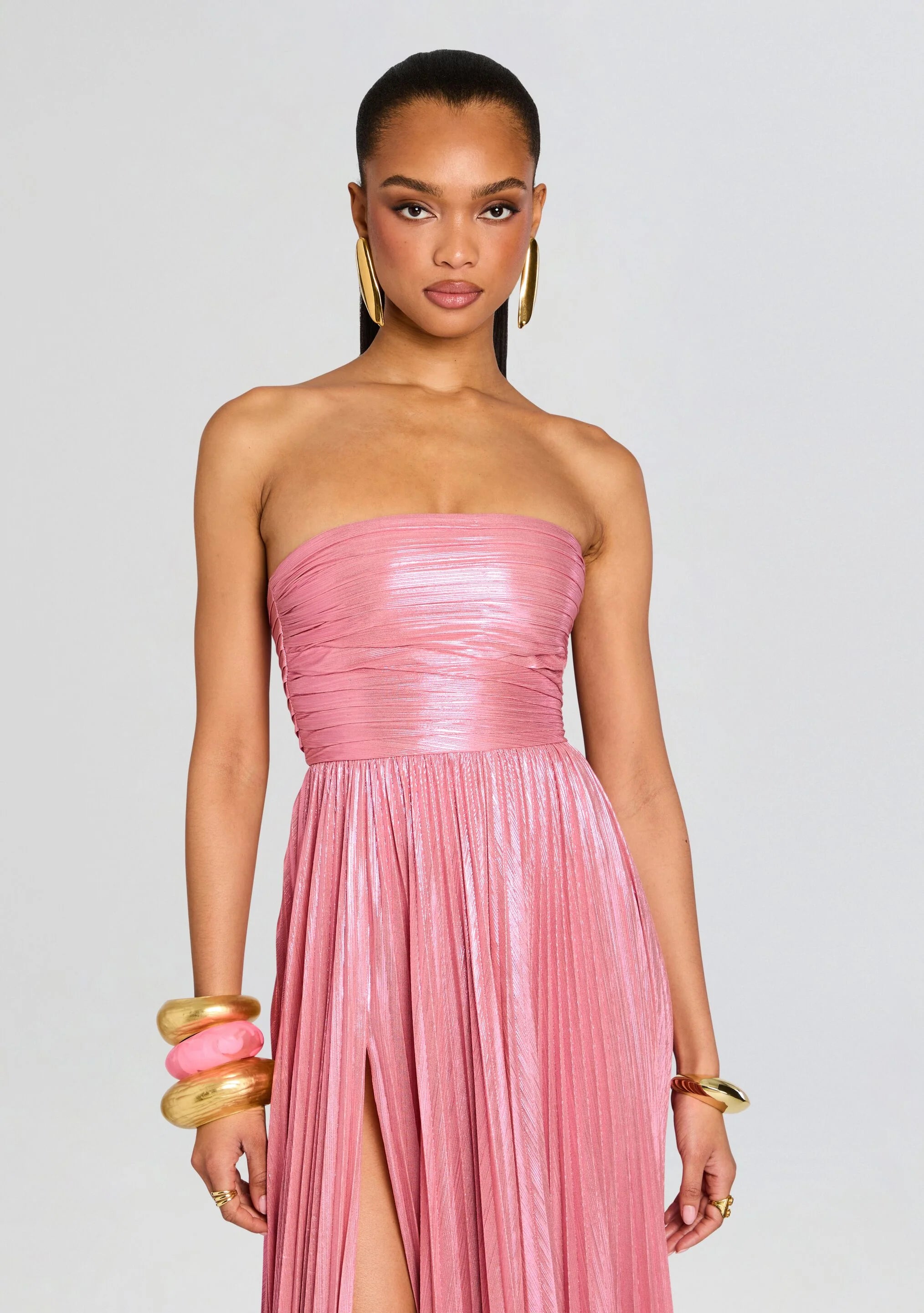The Sevyn Dress exudes grace and style for any special occasion. The strapless gown is crafted with shimmering lame fabric, adding a touch of luxury to the design. With a tasteful slit, this dress will make a statement without saying a word. Elevate your style with Sevyn.
